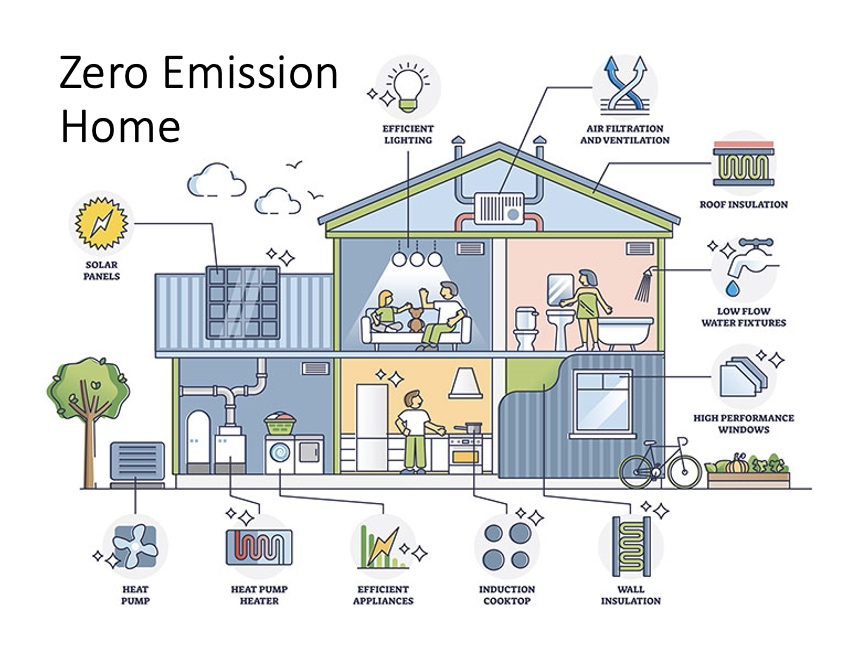 A zero emission home is one that doesn’t burn any fossil fuels (natural gas, propane, etc.) and only uses 100% renewable electricity, either produced on-site or received from the grid. They are typically all electric, have a tight envelope, are well insulated, energy efficient, and provide car charging as well. The following illustration shows common features. A “net zero” home actually produces as much energy as it uses during the course of a year.
